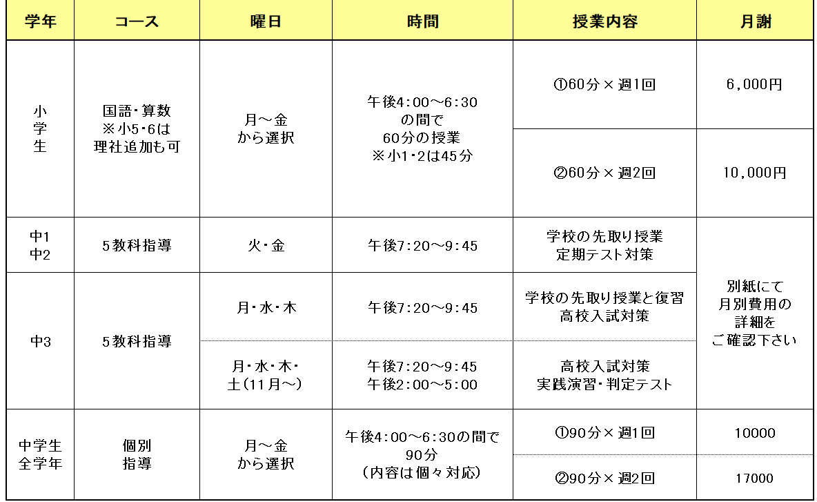 ☆入塾の際の初期費用は[入塾金¥5,000+通年テキスト受講教科分+入塾月分月謝]です。